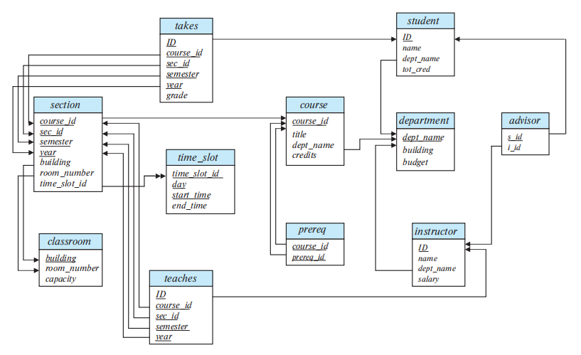一个带有主码和外码约束的数据库模式可以用模式图(schema diagram)来表示。下图展示了用于大学组织机构的模式图。每个关系显示为一个框,关系名用蓝色显示在顶部,并且在框内列出了各属性。主码属性用下划线标注,外码约束用从引用关系的外码属性指向被引用关系的主码属性的箭头来表示。我们使用双头箭头而非单头箭头来表示不是外码约束的引用完整性约束。例如下图中从 \(section\) 关系的 \(time\_ slot\_ id\) 指向 \(time\_ slot\) 关系的 \(time\_ slot\_ id\) 的双头箭头线。